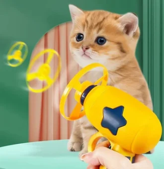 Our Flying Disc Launcher Toy For Kitten & Cats simulates the motion of a real helicopter flight, featuring colorful flying propellers.